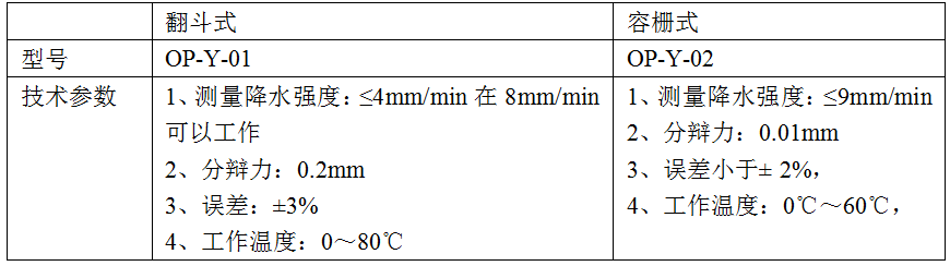 ???? 常用雨量計由容柵式、翻斗式兩種,主要技術指標如下: